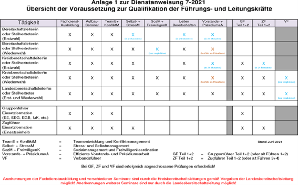 Die Wahl- und Zugangsvoraussetzungen für Leitungs- und Führungskräfte sind verbindlich in der Dienstanweisung der Landesbereitschaftsleitung 7/2021(Anlage 1 und 2) geregelt.